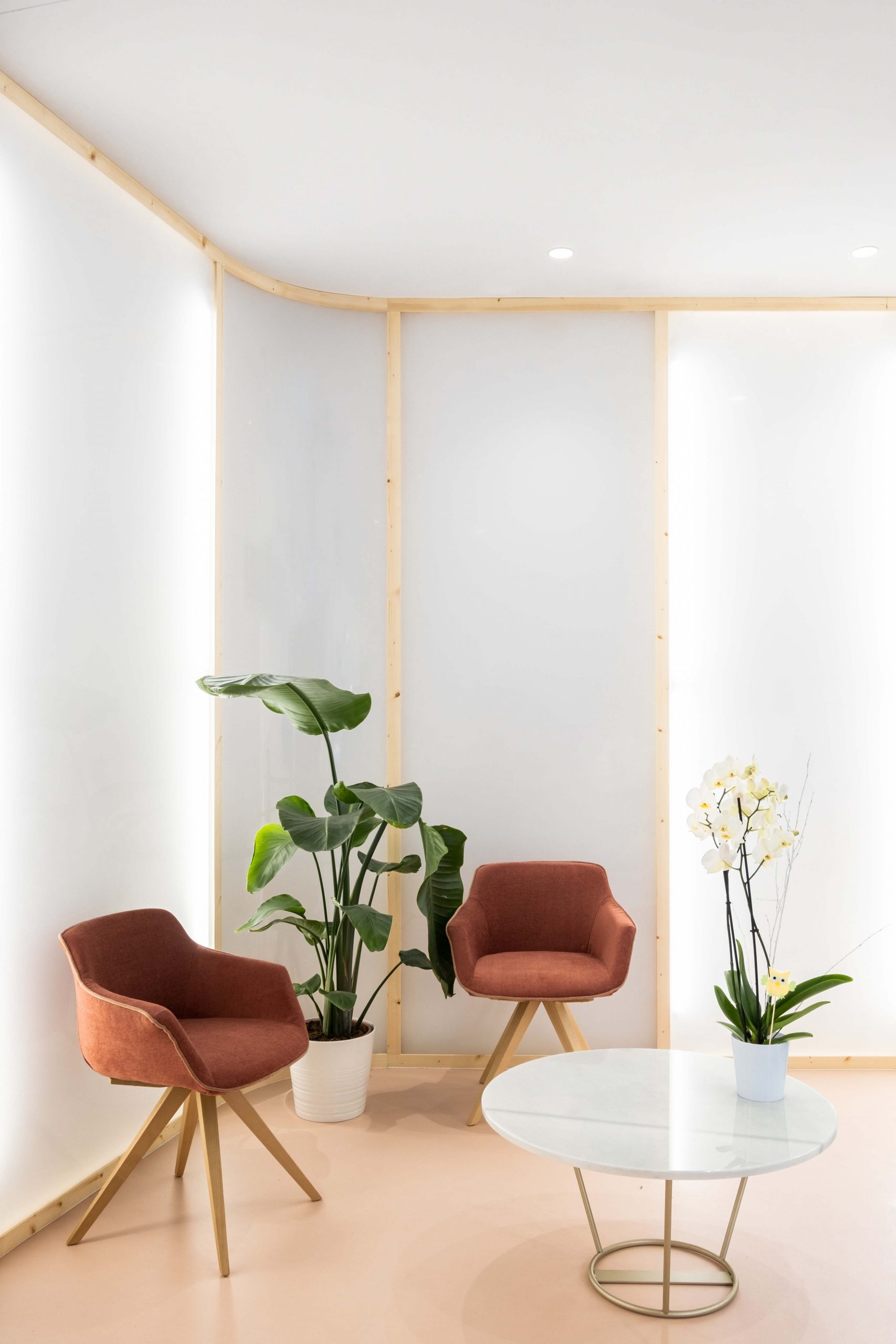 The interior design was born from the hand of Cronotopos and the collaboration of Montse and Sara, generating a space of tranquility and work. The idea for the decoration was a joint one. The materiality of the project is characterized by its purity. The wood is treated with water-based varnishes that allow the reality of its beauty to show through, while contrasting it with a variety of neutral materials. In order to give this skin a project character, it is conceived as a single slatted element, which aims to enhance the continuity between the path and the dilations of the project. A podiatry and physiotherapy clinic needs cleanliness and that the protagonism is taken by wood and light, and the rest is aseptic. We are looking for a quiet space that transmits calmness. Methacrylate supports a clean, continuous surface. It also allows us to make these curves of the skin and allows us that condition of being part of the illumination.