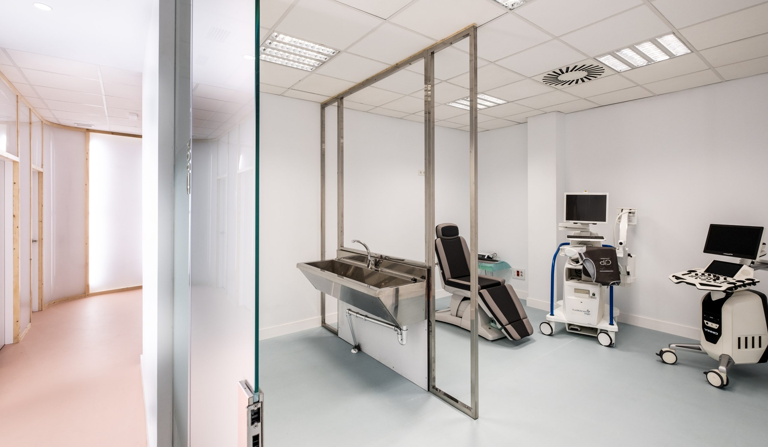 Sara and Montse are two young girls who wanted to open their own podiatry and physiotherapy clinic, so they decided to buy a place that was already a clinic. It was intended to be a beautiful clinic, as well as aseptic. To make the clients feel comfortable and like both the facilities and the image of the clinic. Therefore, a “skin” was established. This skin articulates two expansions in the architectural space; one of them is located at the beginning of the path, forming the public core of the program with the waiting room and reception, and the other expansion is located at the end of the path, serving as a biomechanical room.
