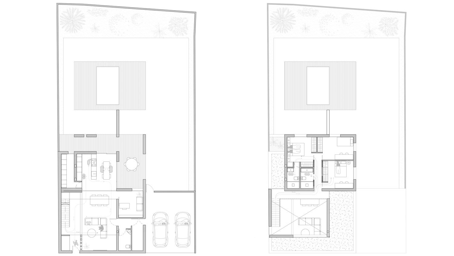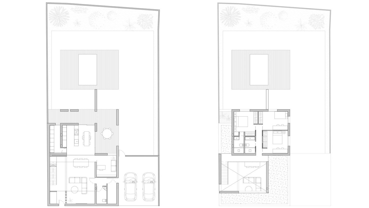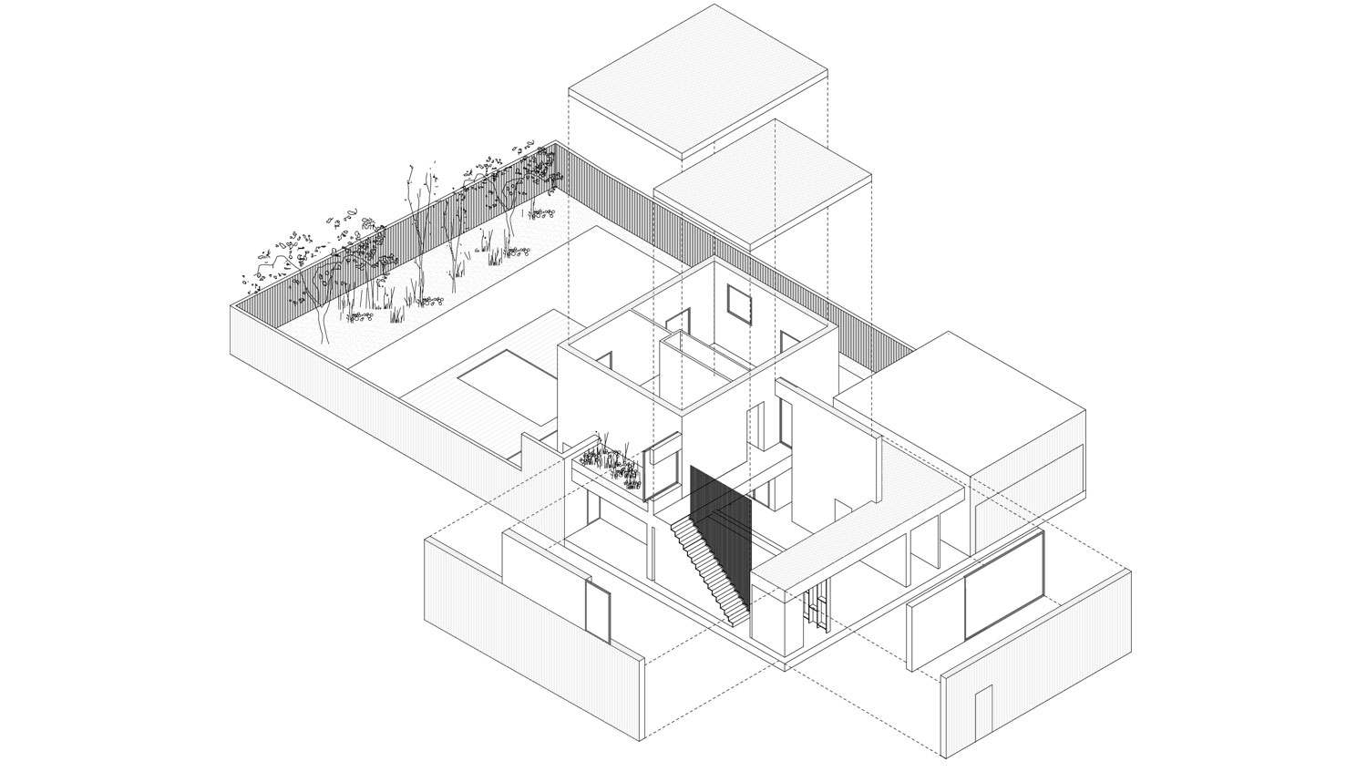 Por encima de la pieza de planta baja, emergen dos piezas más con distintas alturas. Una de ellas materializa la doble altura del salón, mientras que la otra alberga los espacios de noche del proyecto.