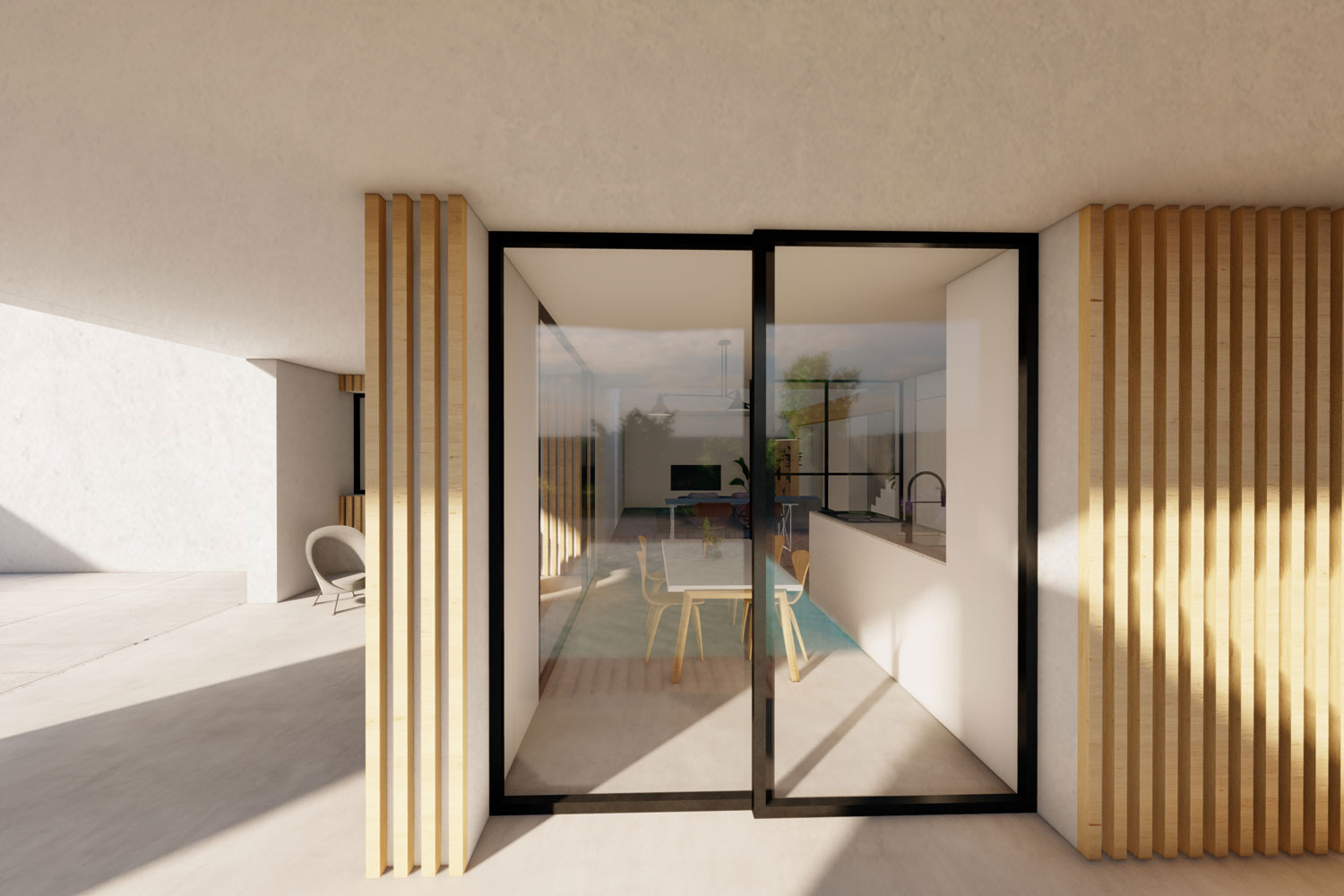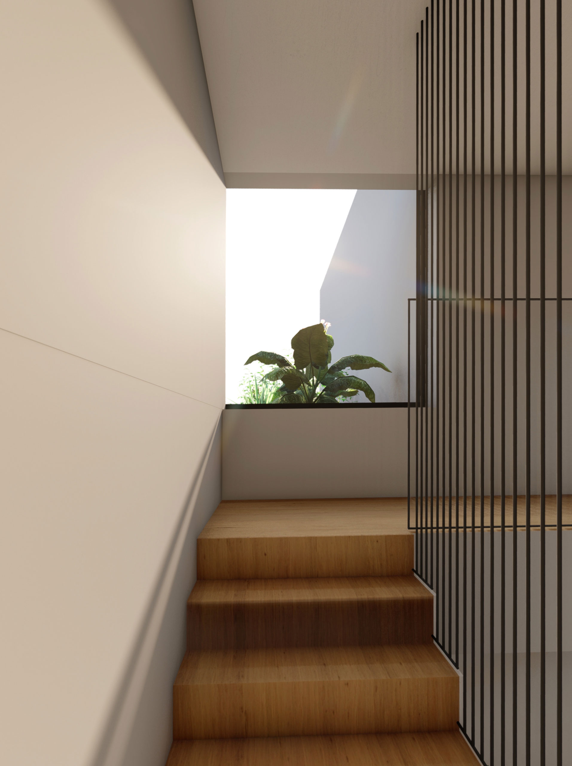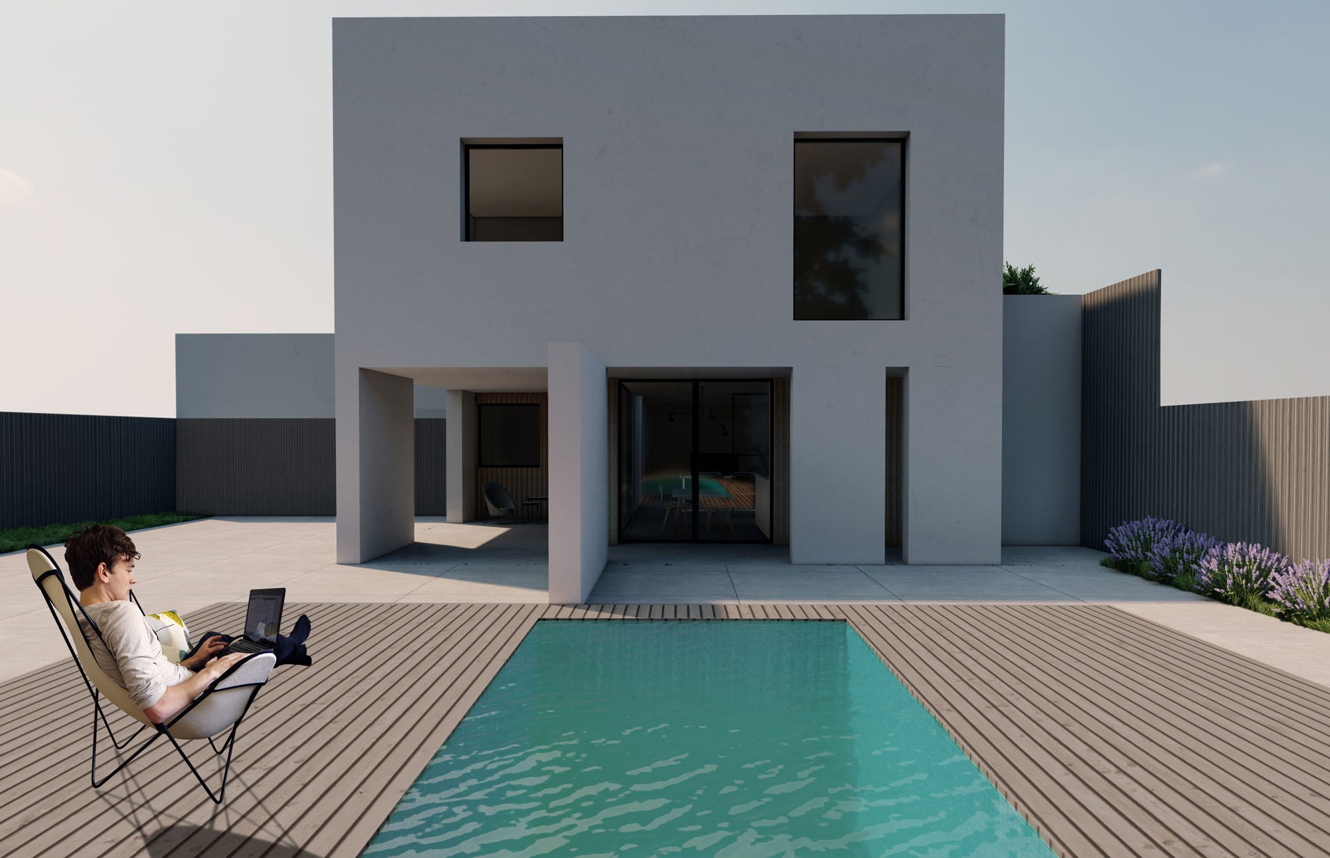 La fachada, cierra el proyecto al exterior, haciendo que la vivienda mire hacia adentro y favoreciendo la privacidad.
