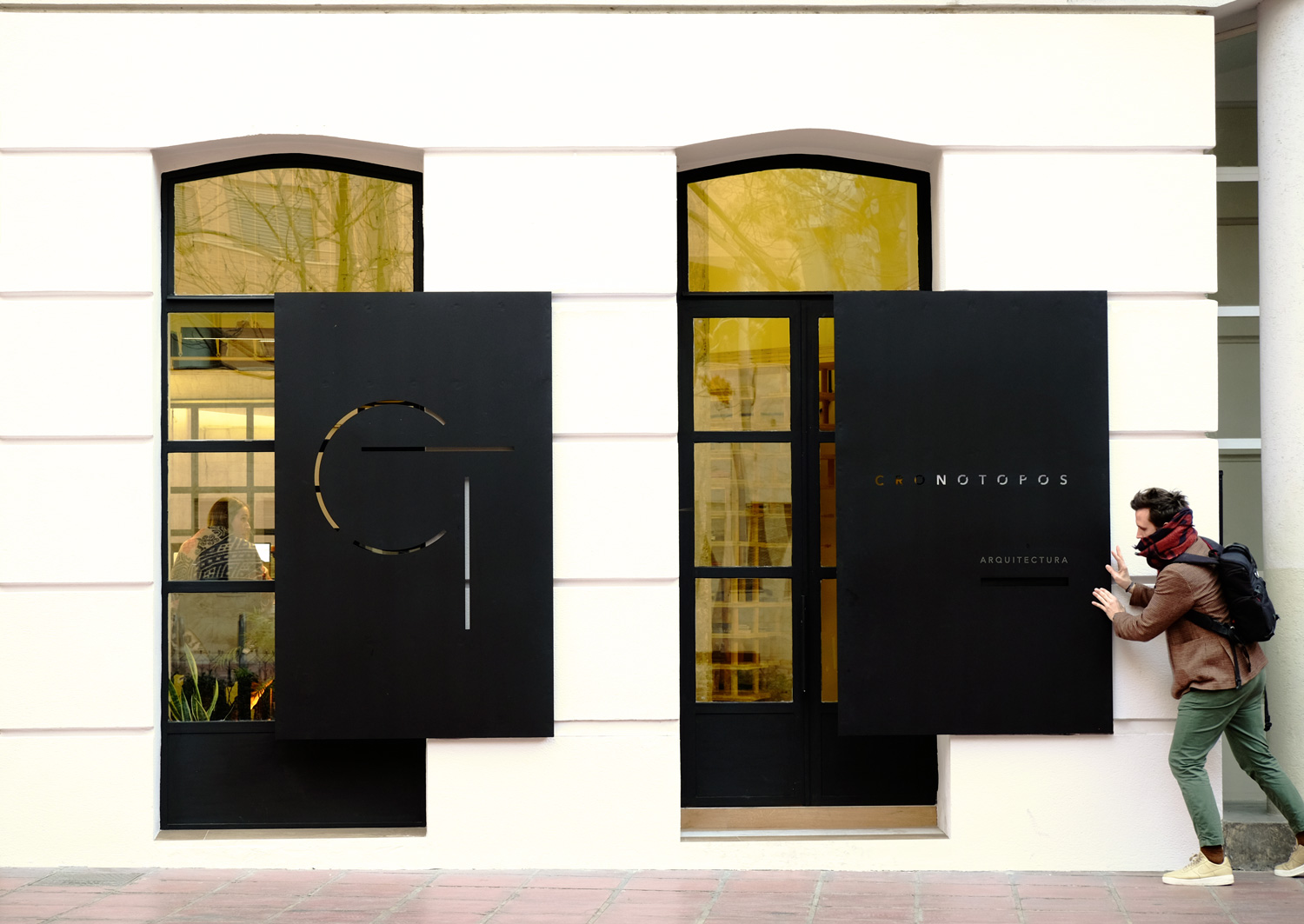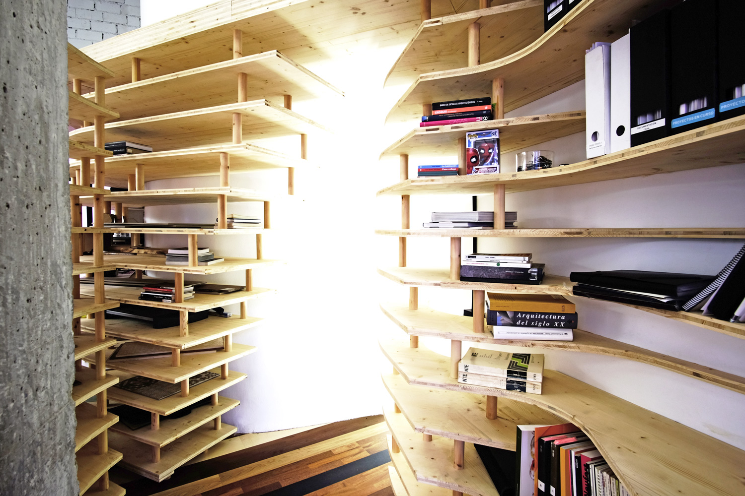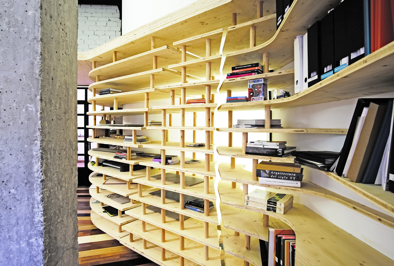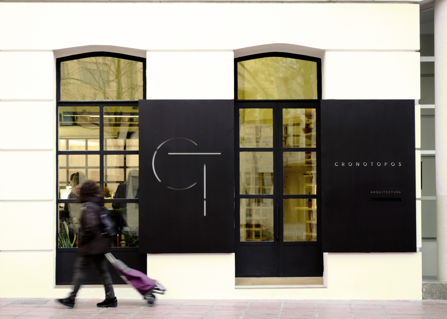 El diseño de interiores para el local de CRONOTOPOS nace como una dualidad. CRONOS es el que articula y, es que, su disposición en el margen oeste, potencia y mejora la gemotría sensual original del estudio a través de la construcción de un elemento polivalente e indefinido. Así es como se diseña un interior a través de un elemento vivo que es una estantería y una mesa, un asiento y una escalera, un office y un altillo, un acceso y un macetero… El CRONOS como elemento vivo, da servicio al espacio en blanco delimitado por ese frente este que tan estrictamente existía antes de la intervención.