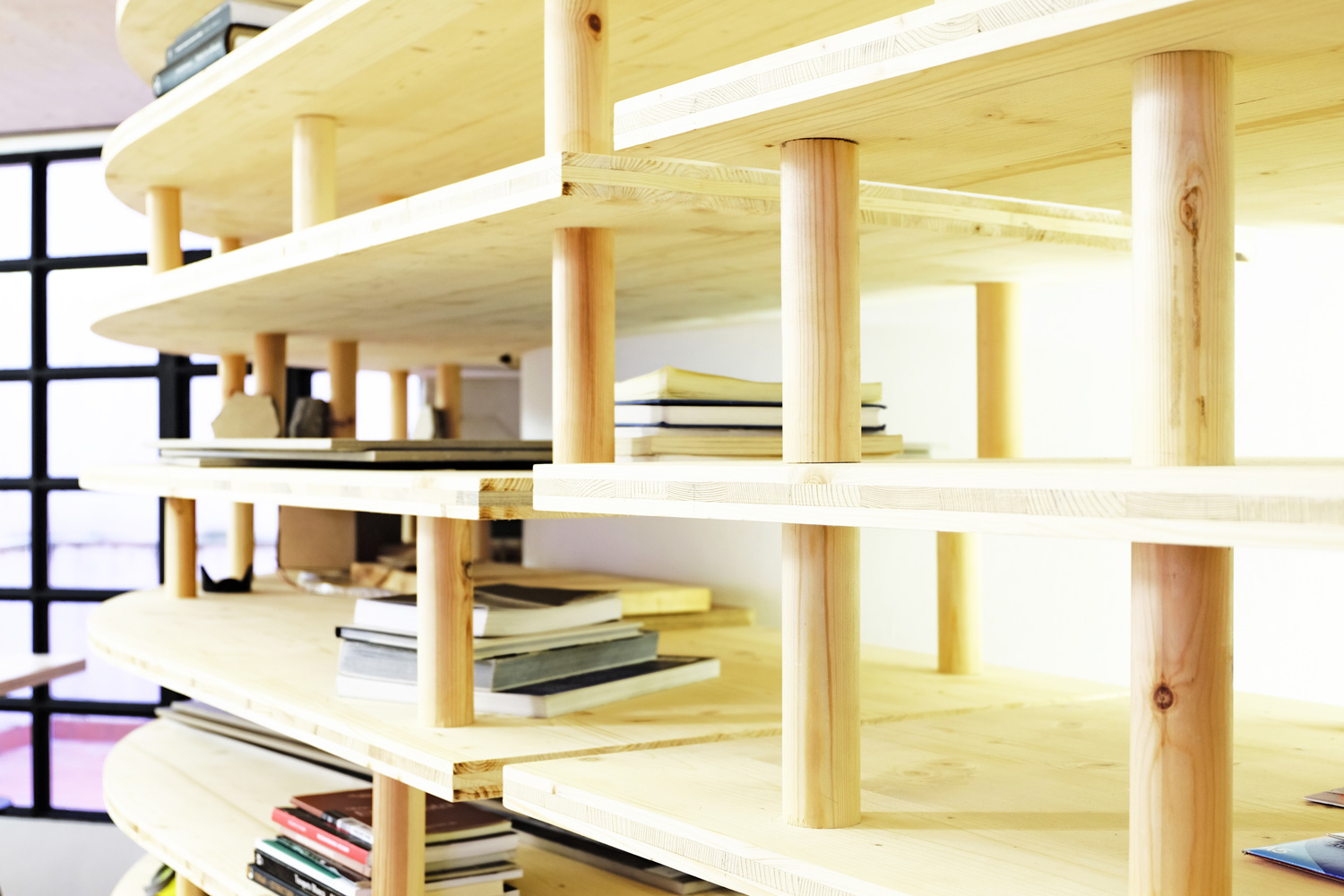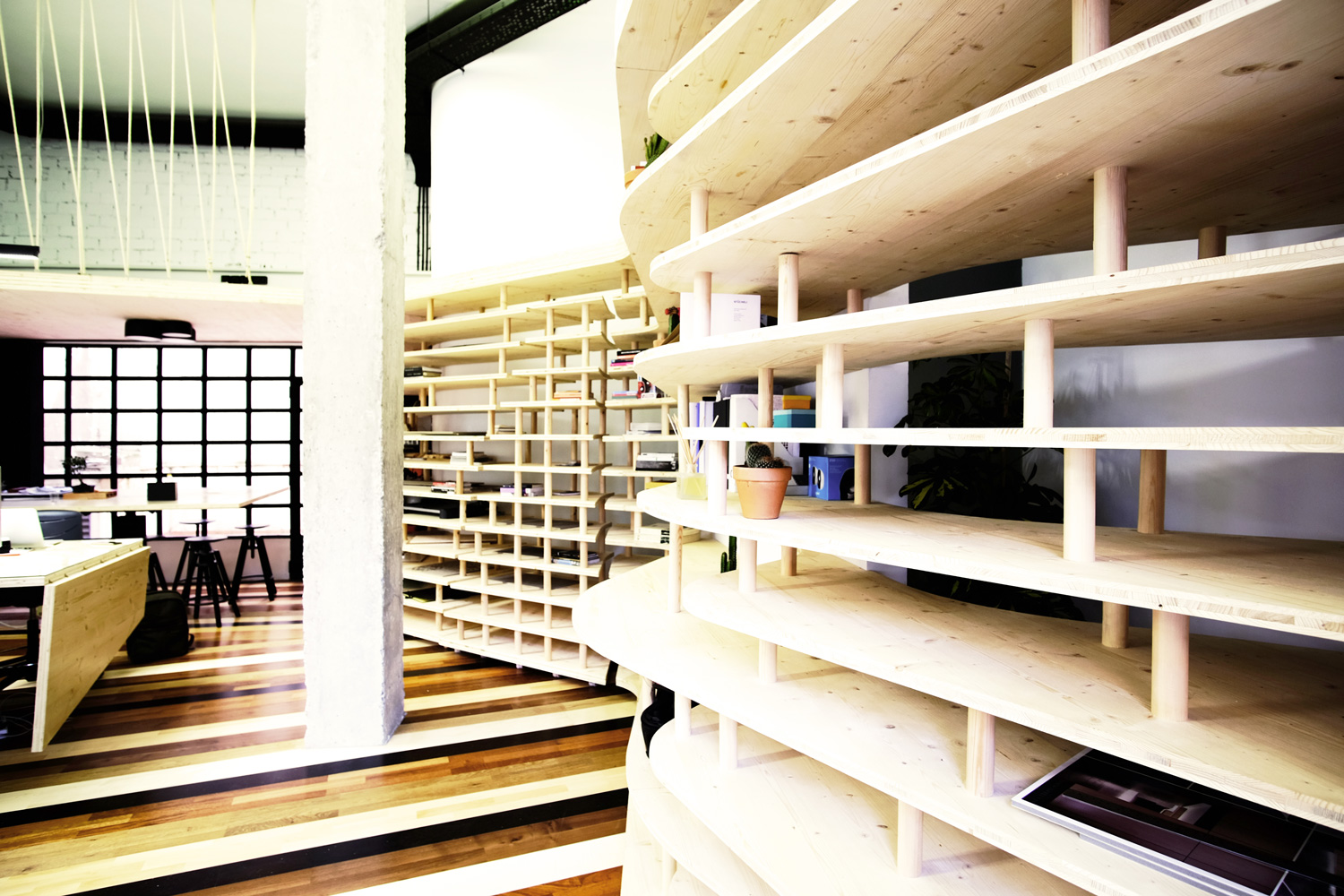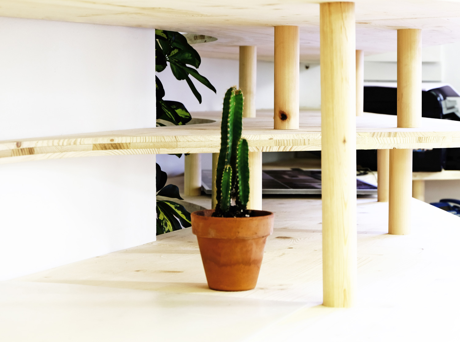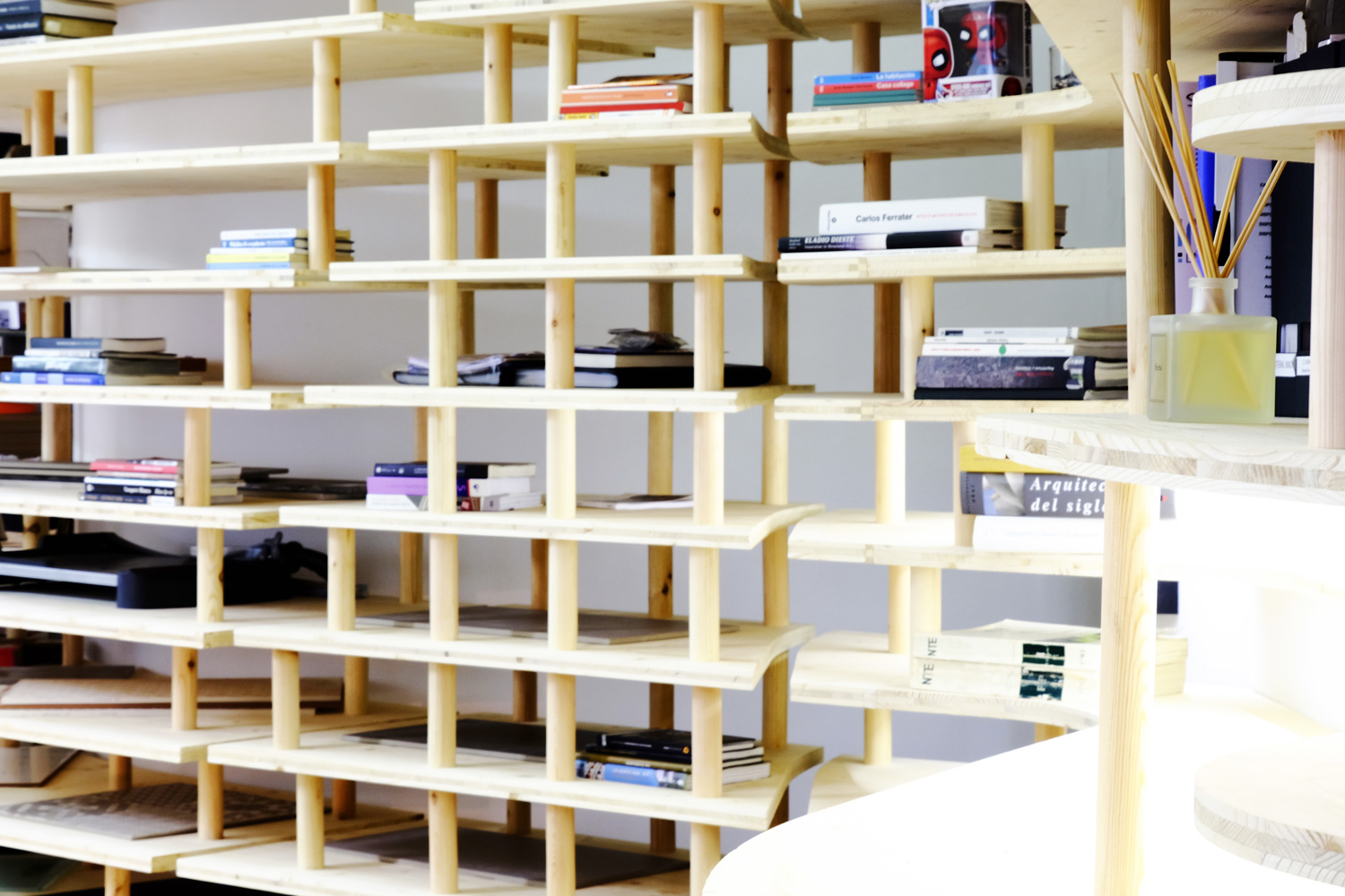 El diseño de interiores para el local de CRONOTOPOS nace como una dualidad. CRONOS es el que articula y, es que, su disposición en el margen oeste, potencia y mejora la gemotría sensual original del estudio a través de la construcción de un elemento polivalente e indefinido. Así es como se diseña un interior a través de un elemento vivo que es una estantería y una mesa, un asiento y una escalera, un office y un altillo, un acceso y un macetero… El CRONOS como elemento vivo, da servicio al espacio en blanco delimitado por ese frente este que tan estrictamente existía antes de la intervención.