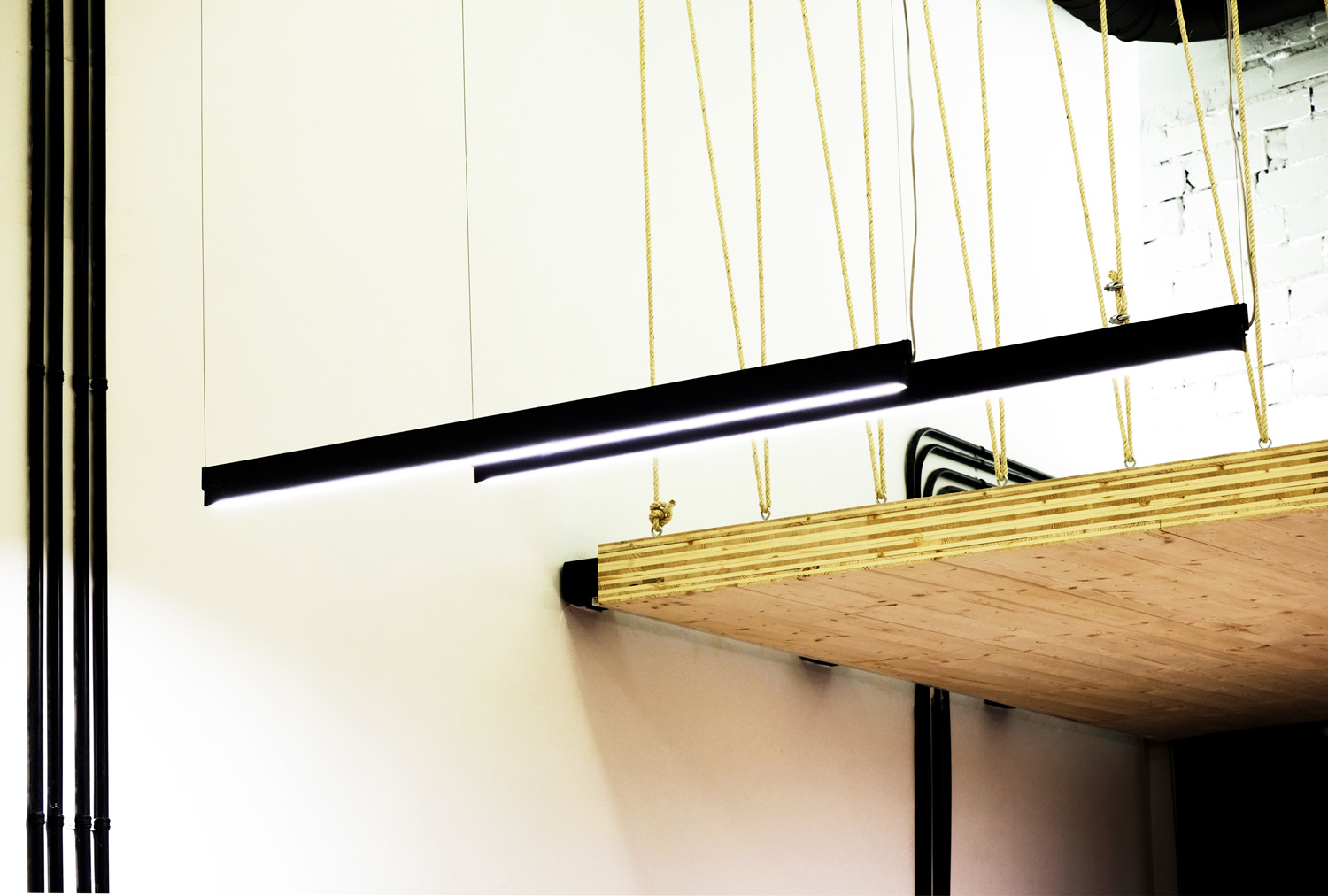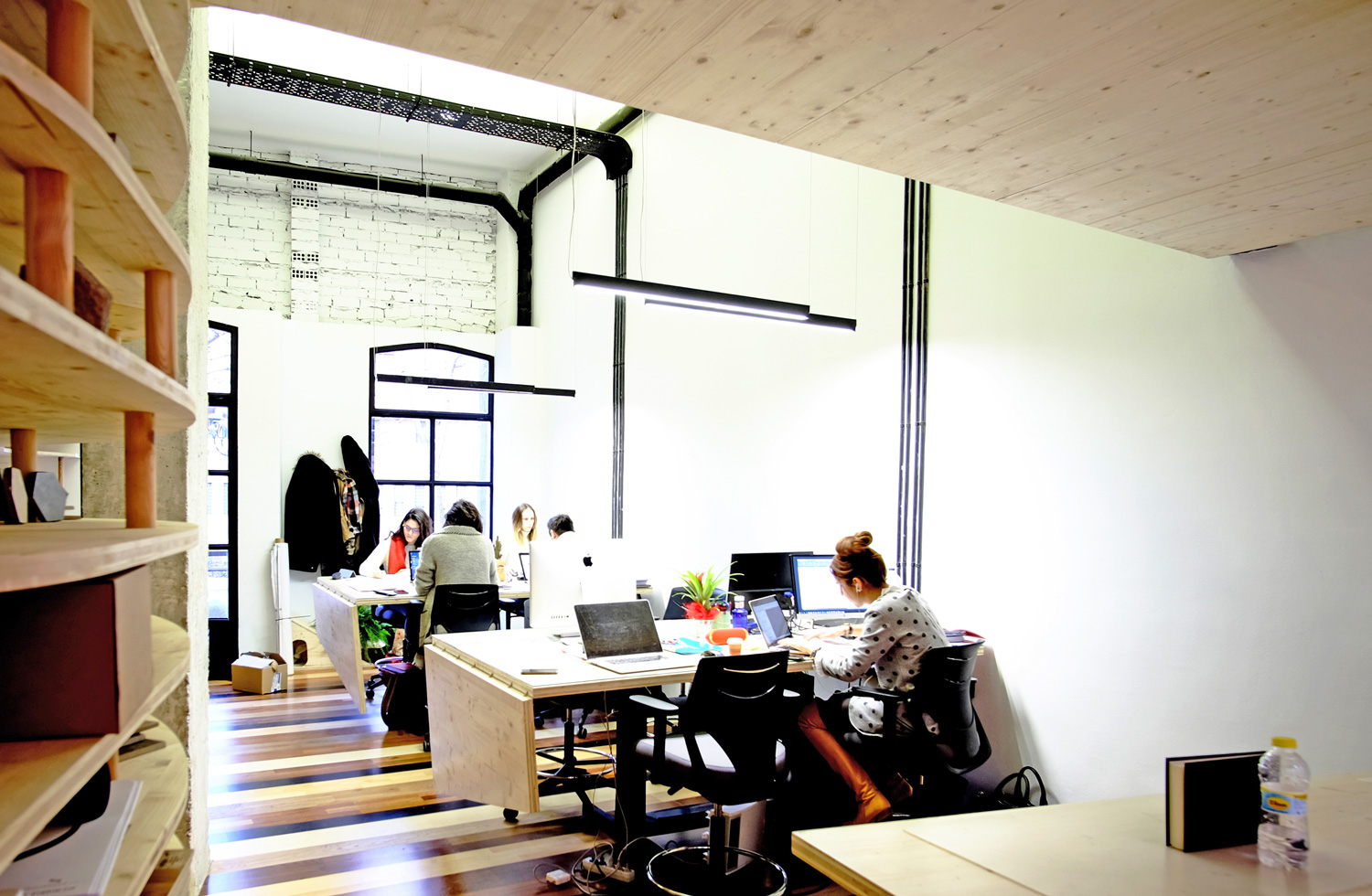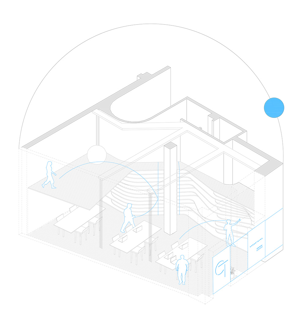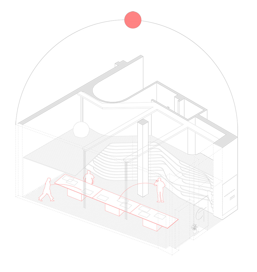 El diseño de interiores del local, de este modo, se genera como una secuencia de espacios de trabajo graduada hacia el patio interior y, al mismo tiempo, como un espacio expositivo y colaborativo cuando el mobiliario trabaja en su conjunto.