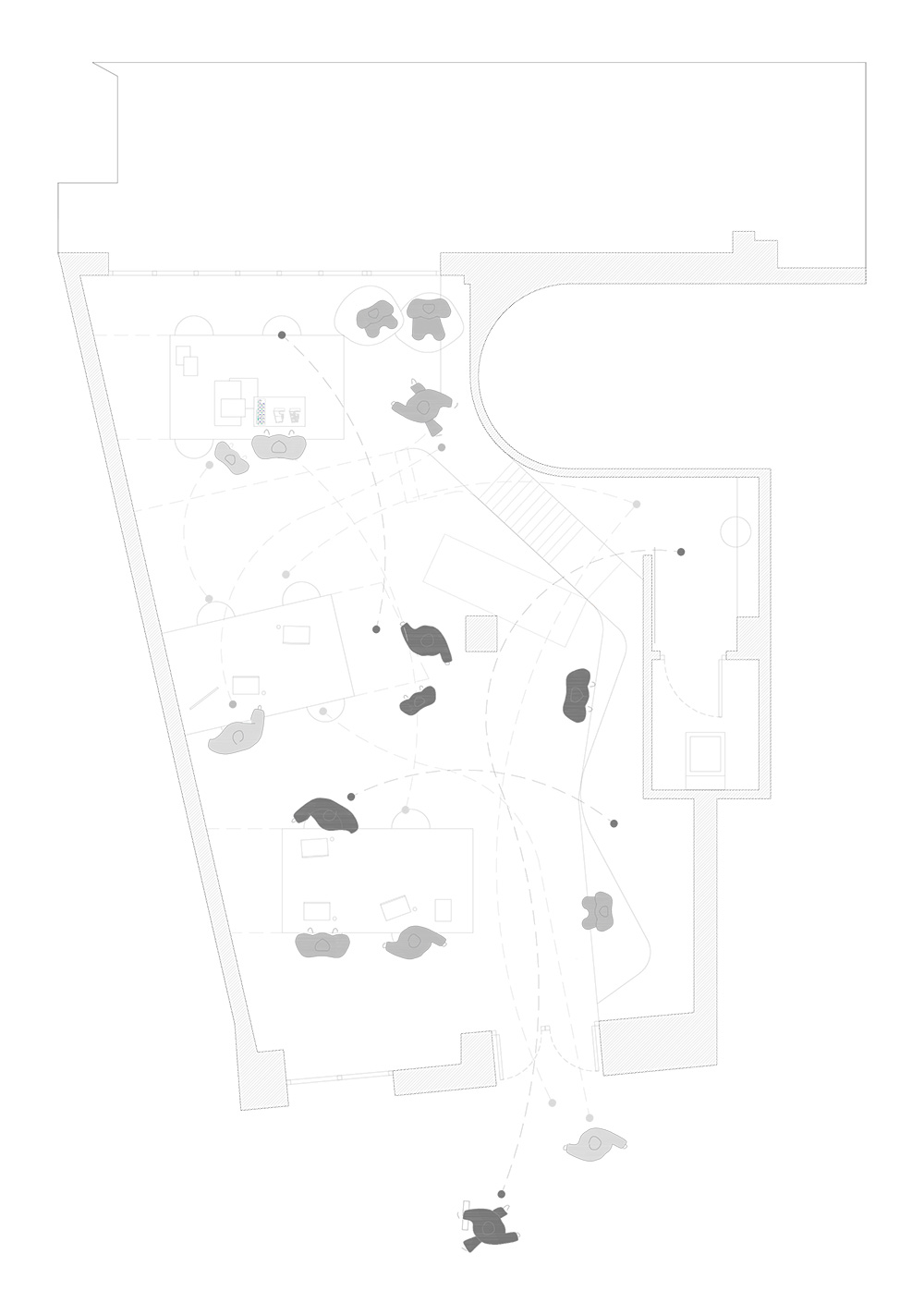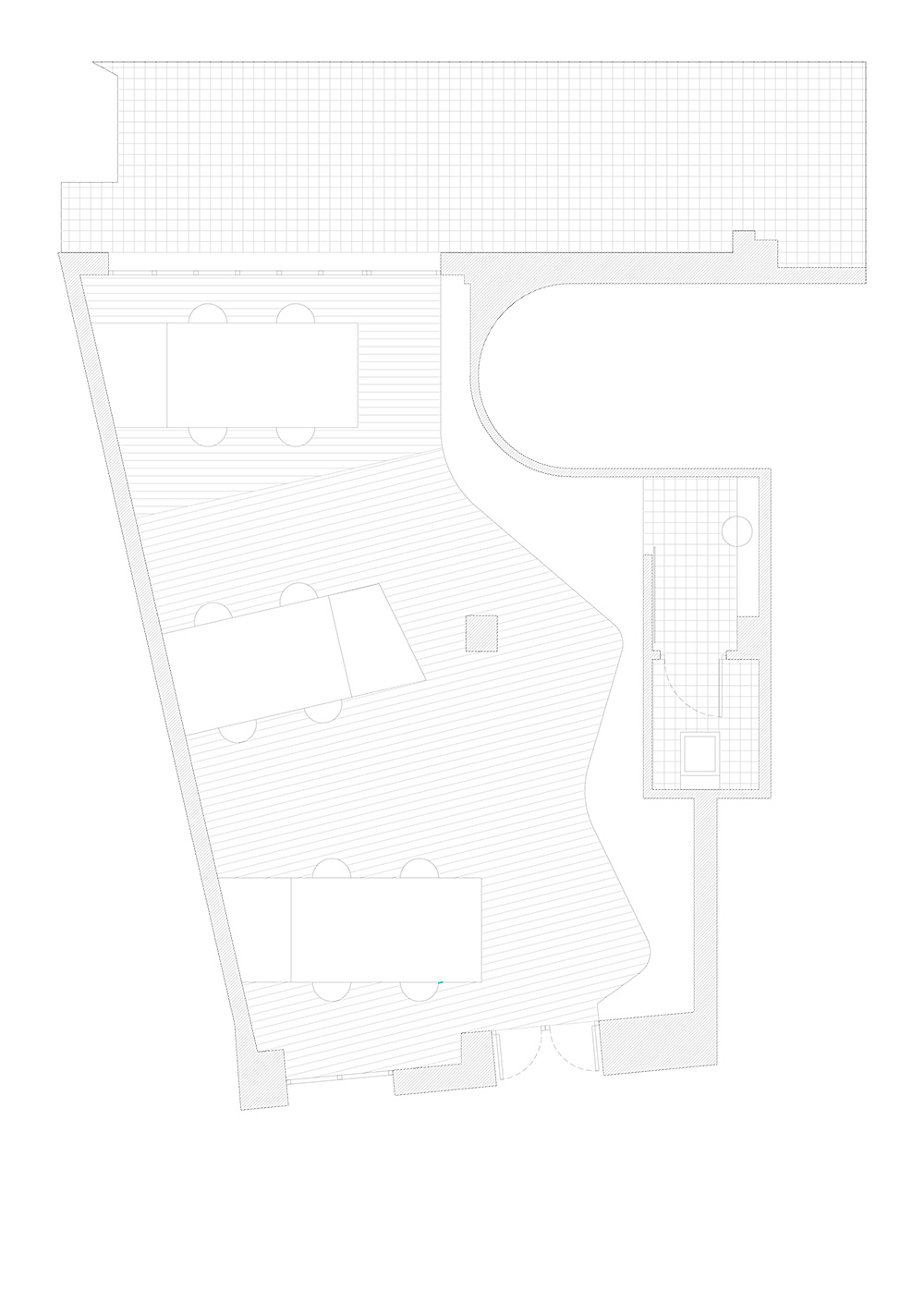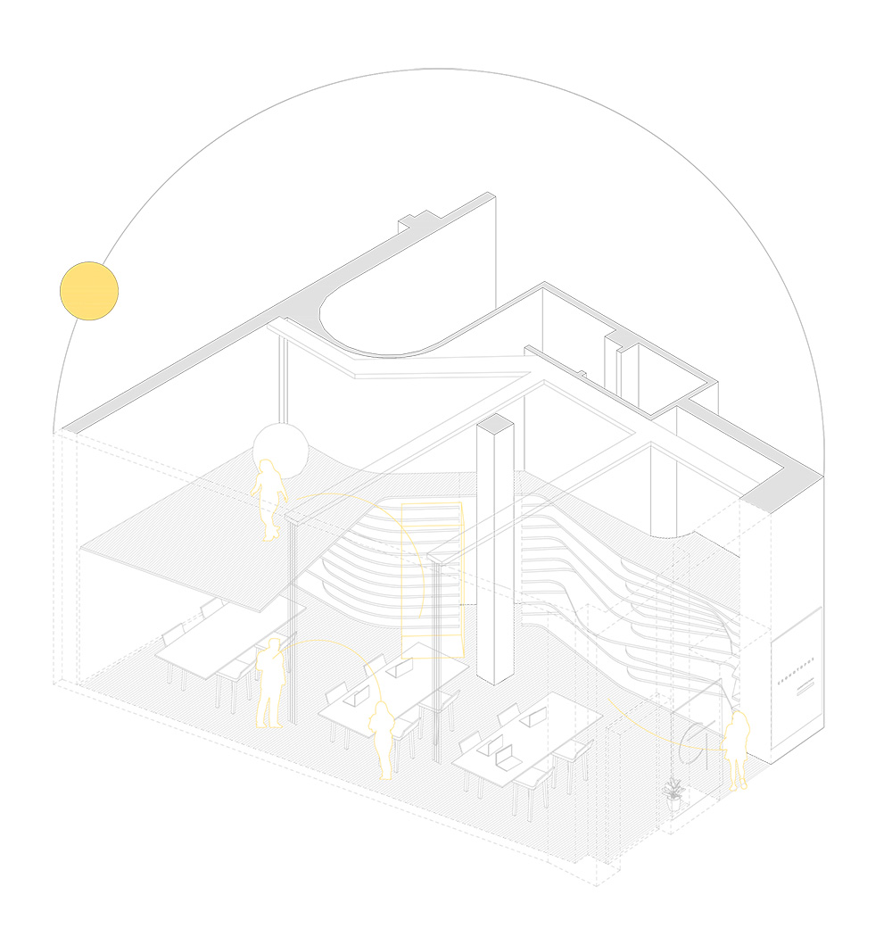 La preexistencia ya suponía un conjunto de dualidades sin jerarquía. La luz indirecta de norte rivalizaba con la luz directa de sur al estar ambos extremos espacialmente divididos. Longitudinalmente existían dos geometrías muy marcadas, la orientada a este se presentaba como una recta agresiva y tenaz, mientras la oeste era una tímida curva sensual que daba acceso a un baño abandonado.