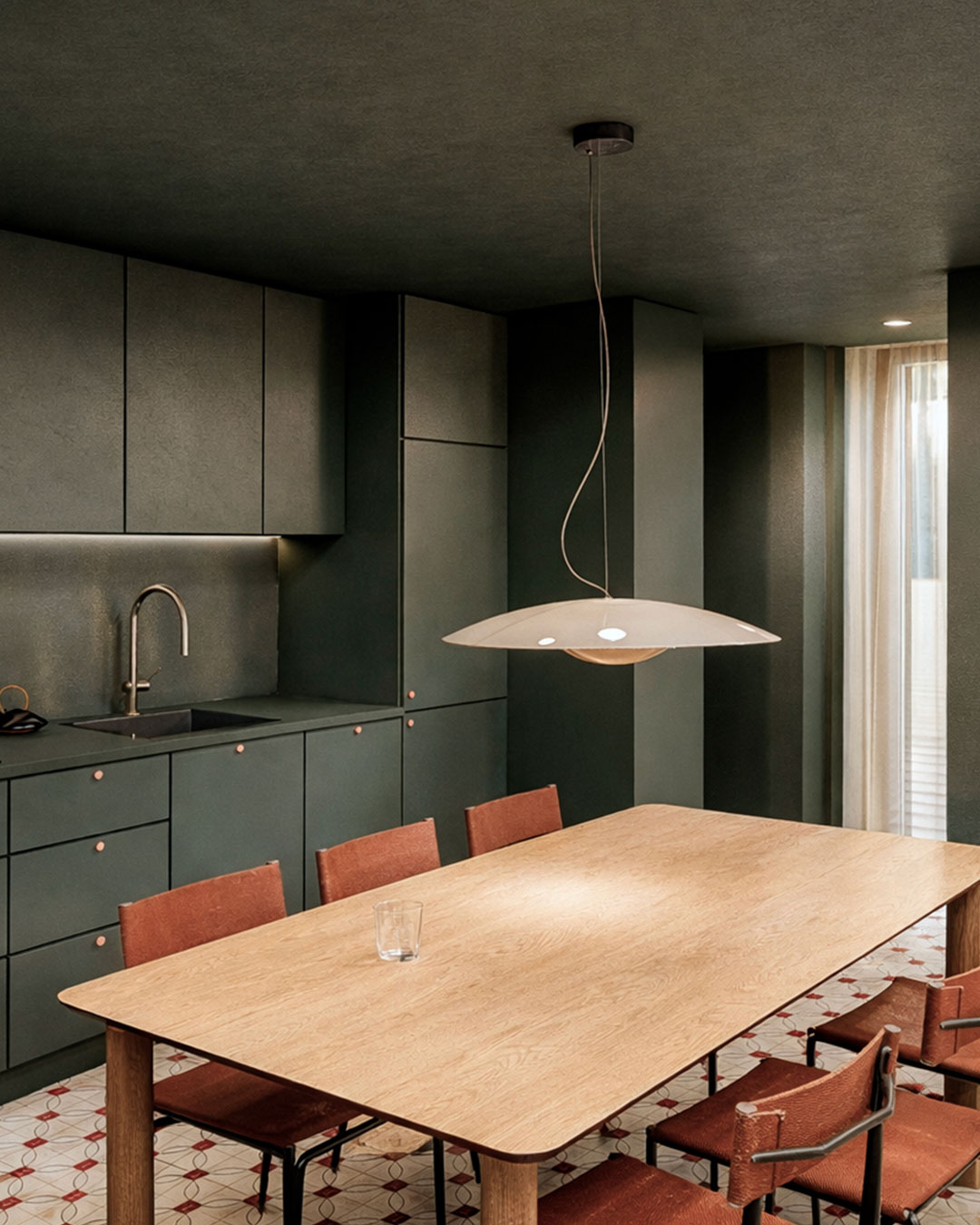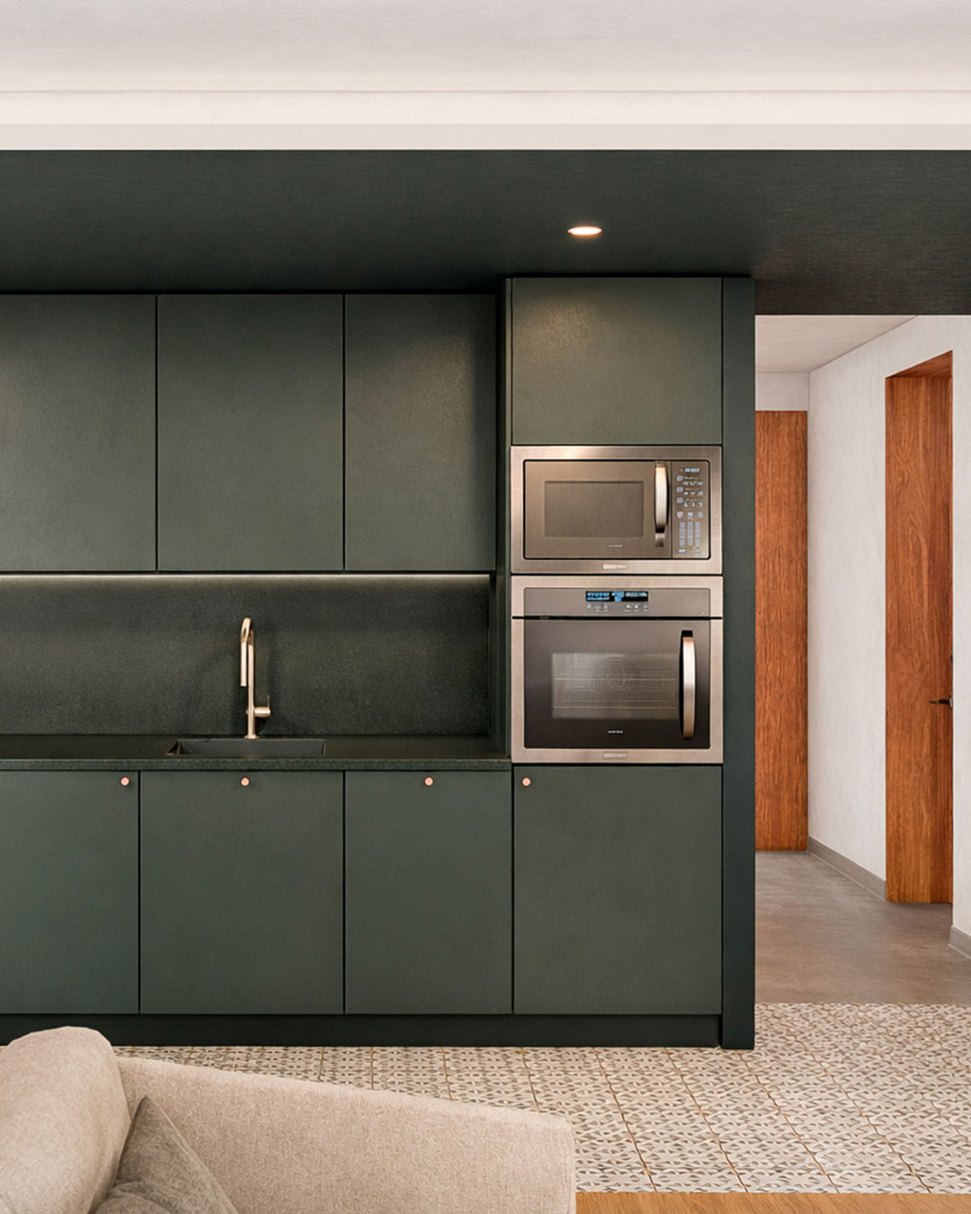 El color, presente especialmente en tonos verdes, no se entiende como un recurso superficial o decorativo, sino como una herramienta activa dentro del proyecto.