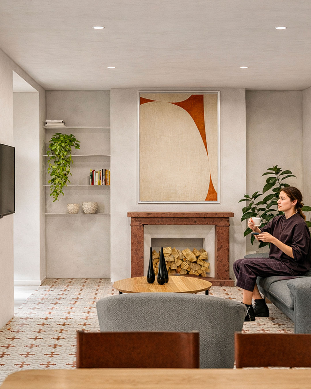 Las baldosas recuperadas conservan la memoria del lugar, aportando textura, carácter y arraigo. Frente a ellas, los nuevos pavimentos introducen una base neutra que permite unificar el conjunto y actualizar la vivienda sin perder su esencia.