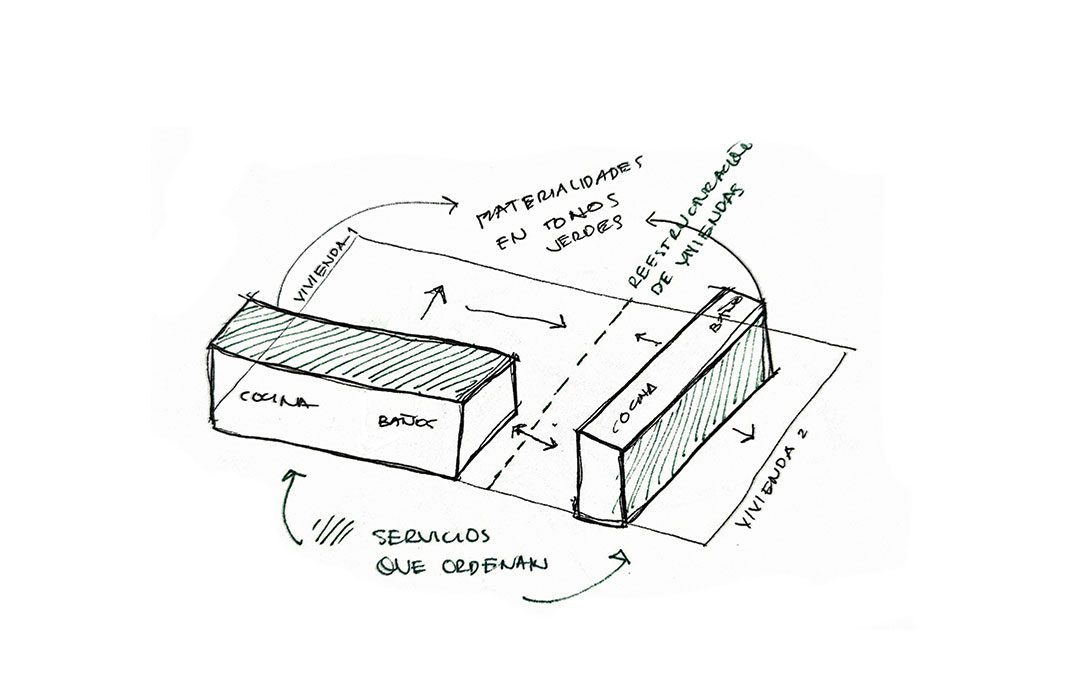 Dos viviendas independientes emergen sin perder su vínculo con el origen, organizadas a partir de una estrategia en la que el espacio, el color y la materia trabajan de forma conjunta para construir una nueva forma de habitar.