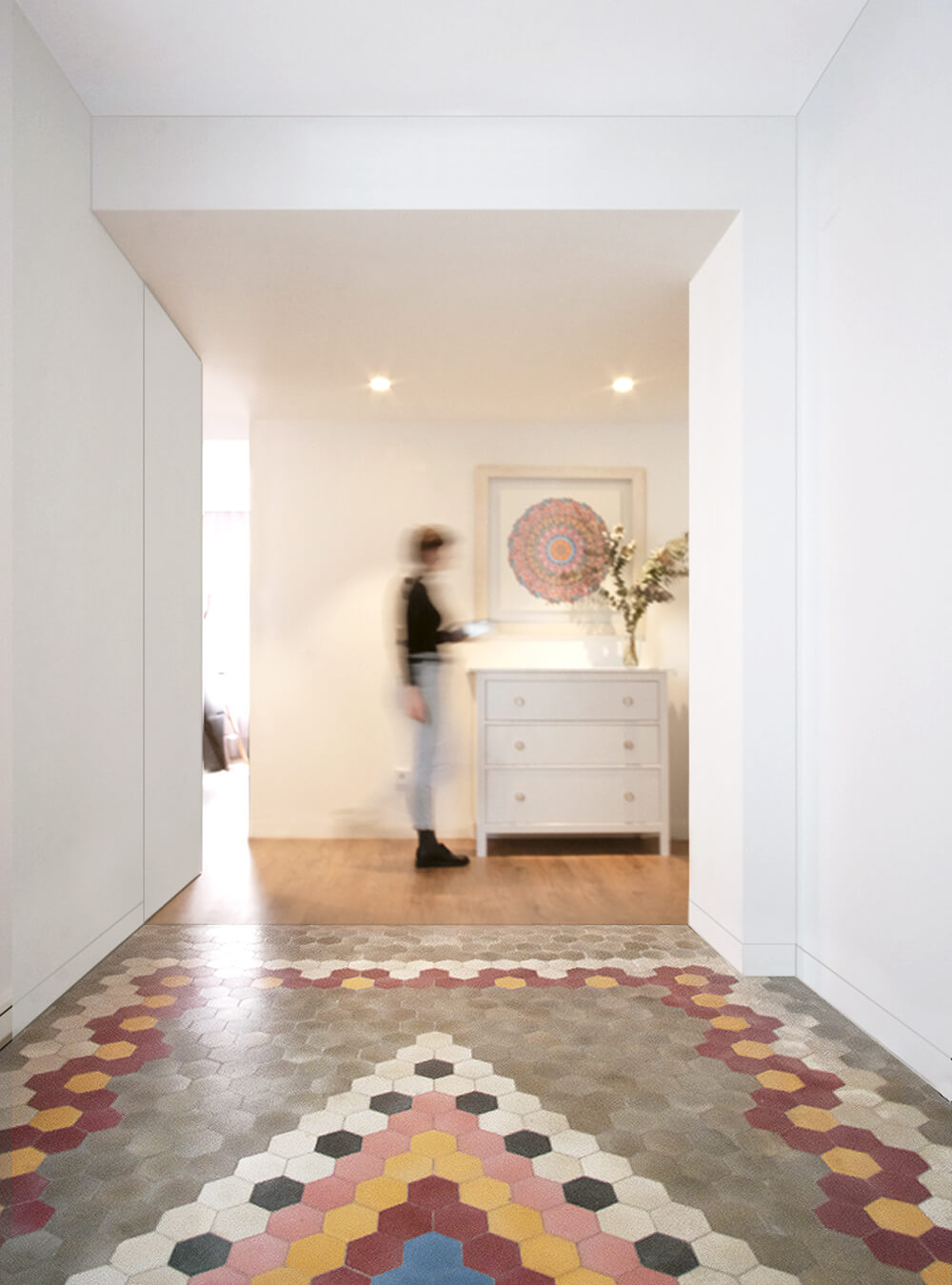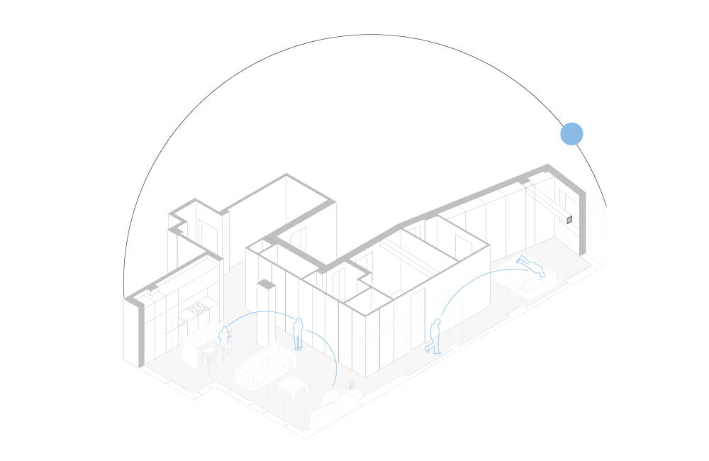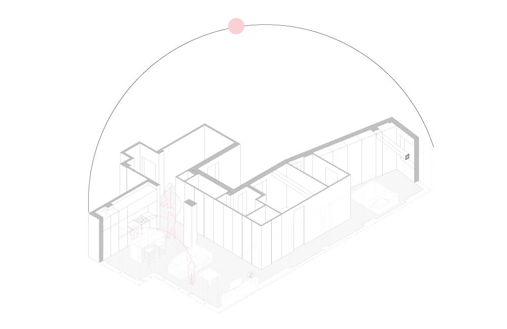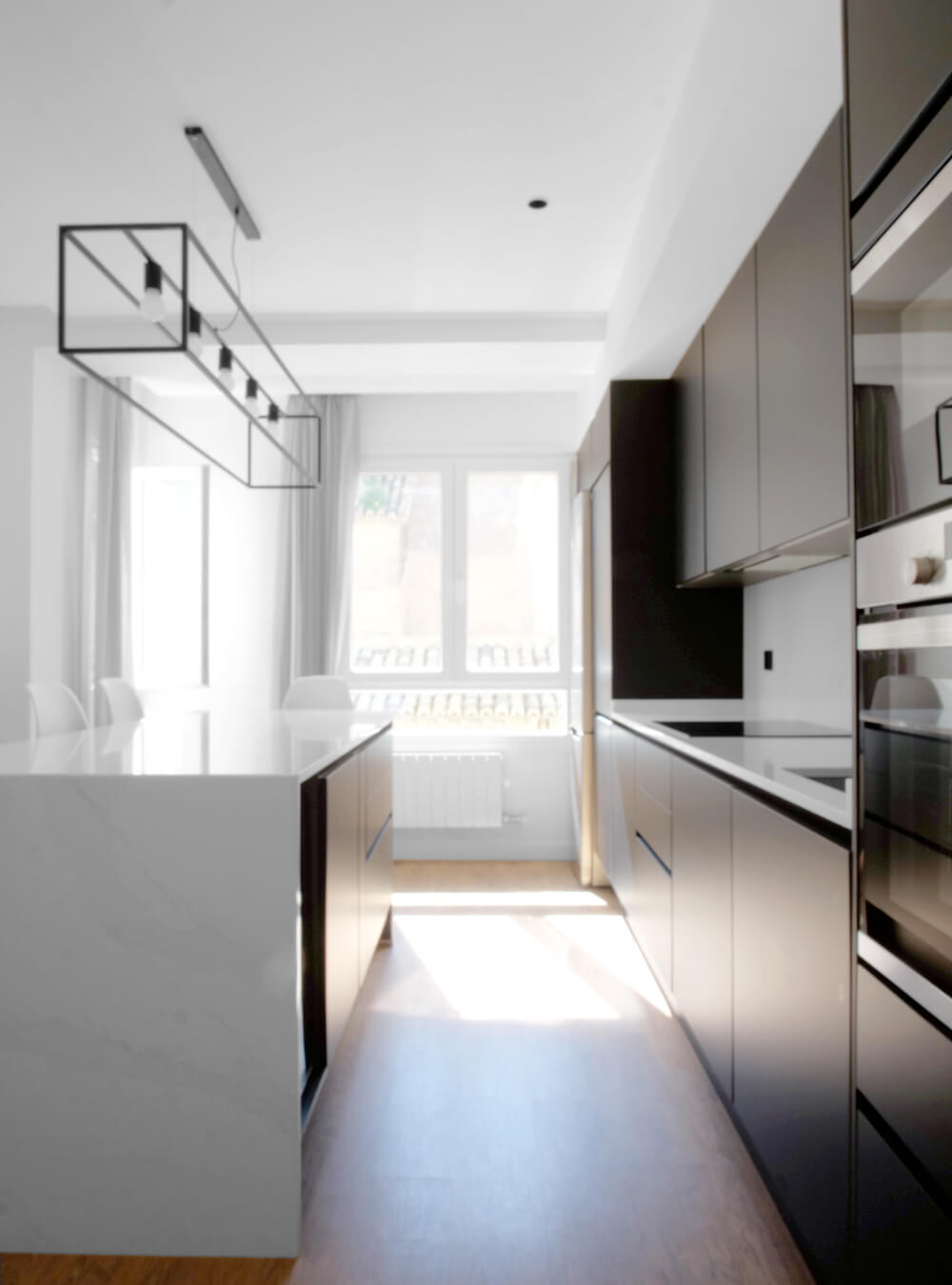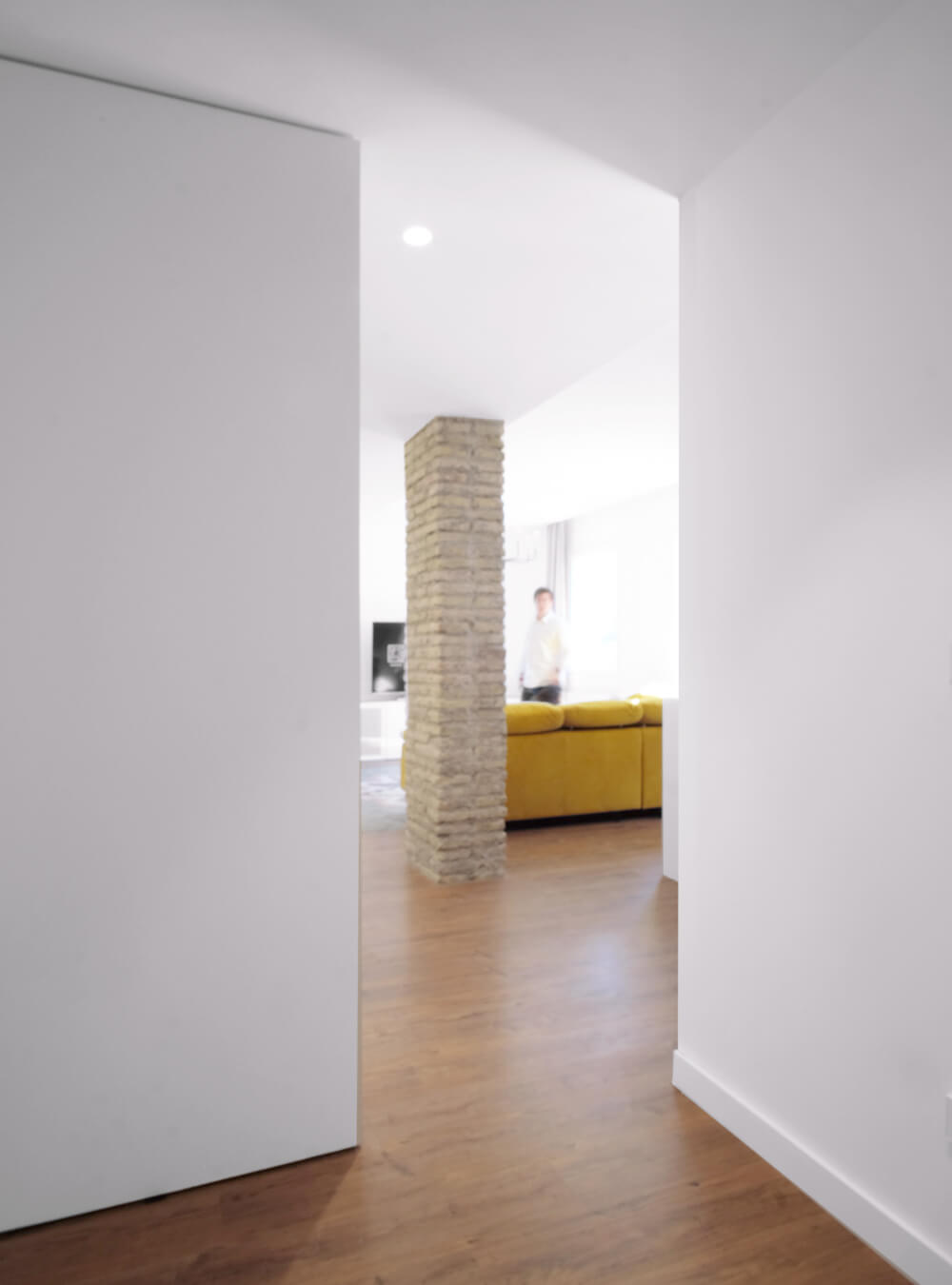 Lo cierto es que, la importancia de este hecho fue tal que la reforma integral de vivienda con Flor y Quique como clientes se desarrolló de la manera más natural. El espacio público se generó como un TOPOS único formado por un salón comedor y cocina que hacían de escenario entre el fondo del telón de la iglesia y el espacio de circulación de la reforma integral de la vivienda.