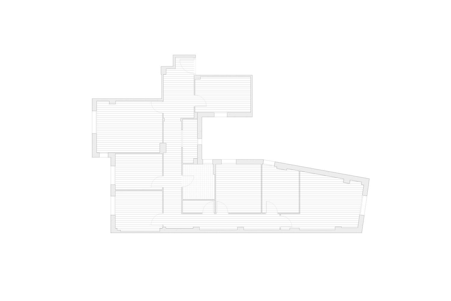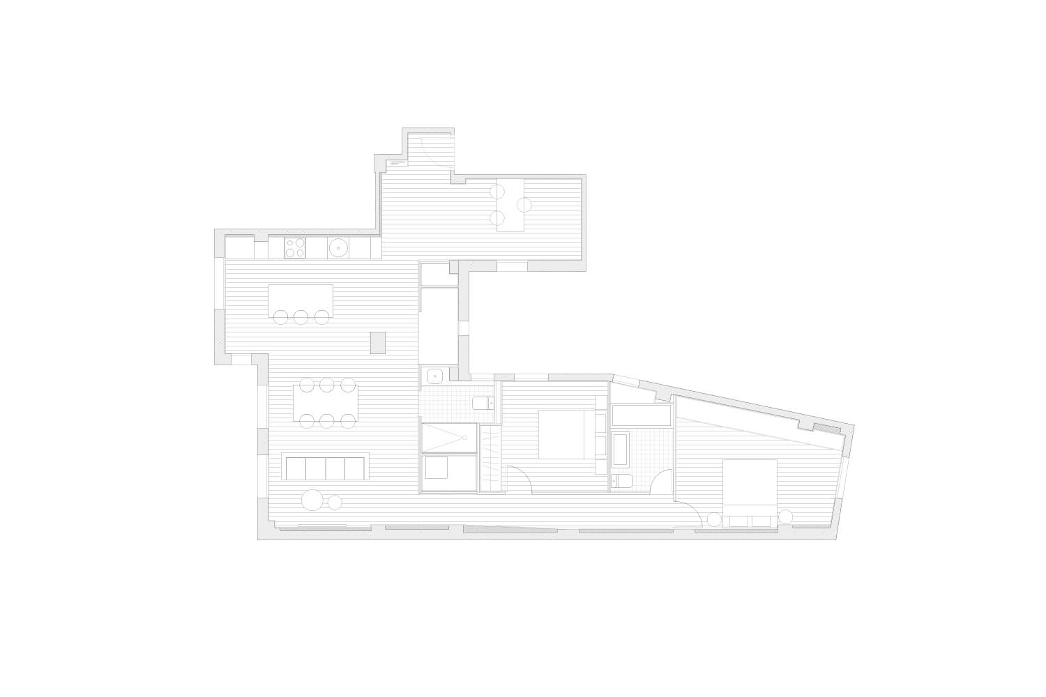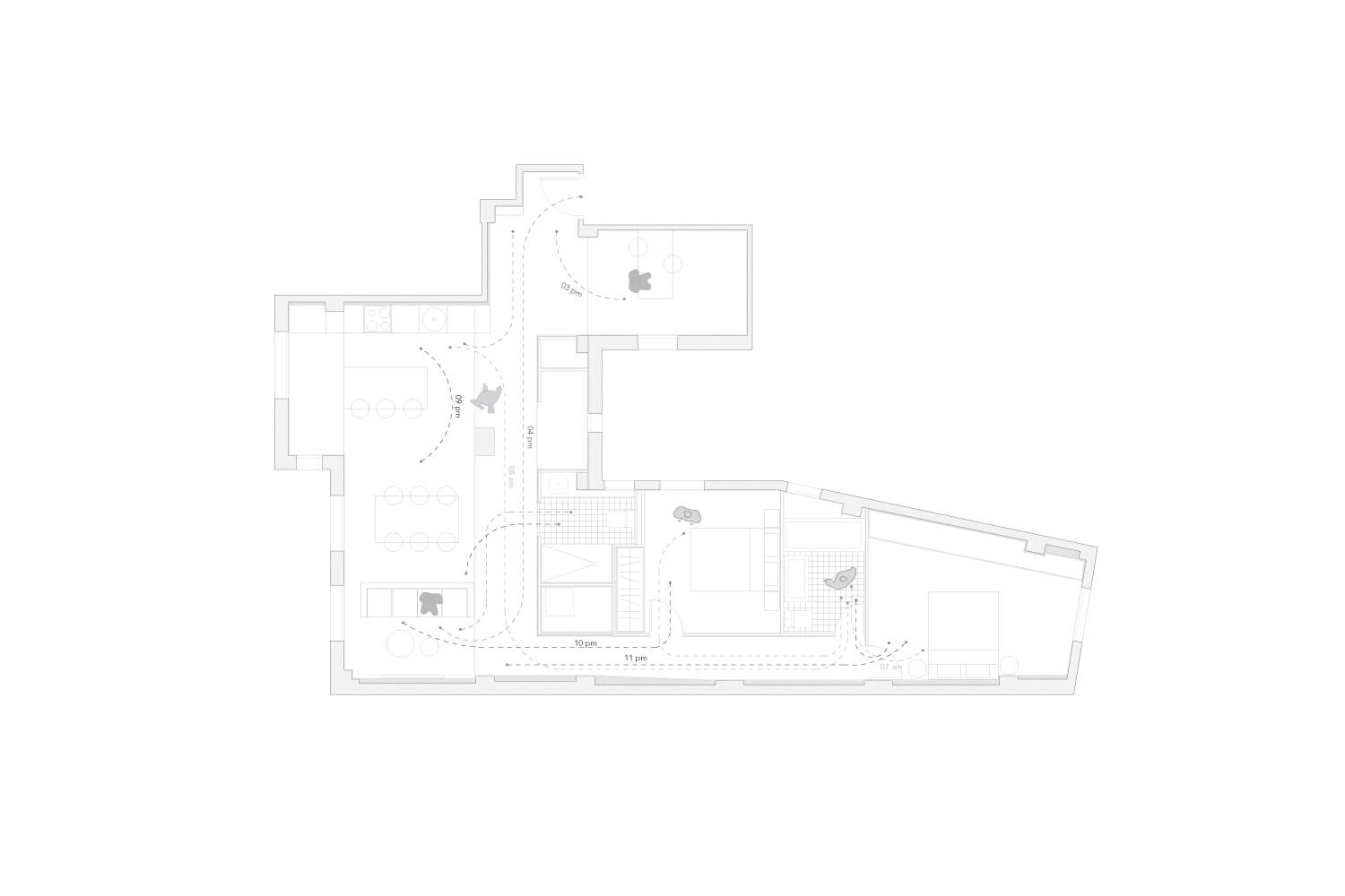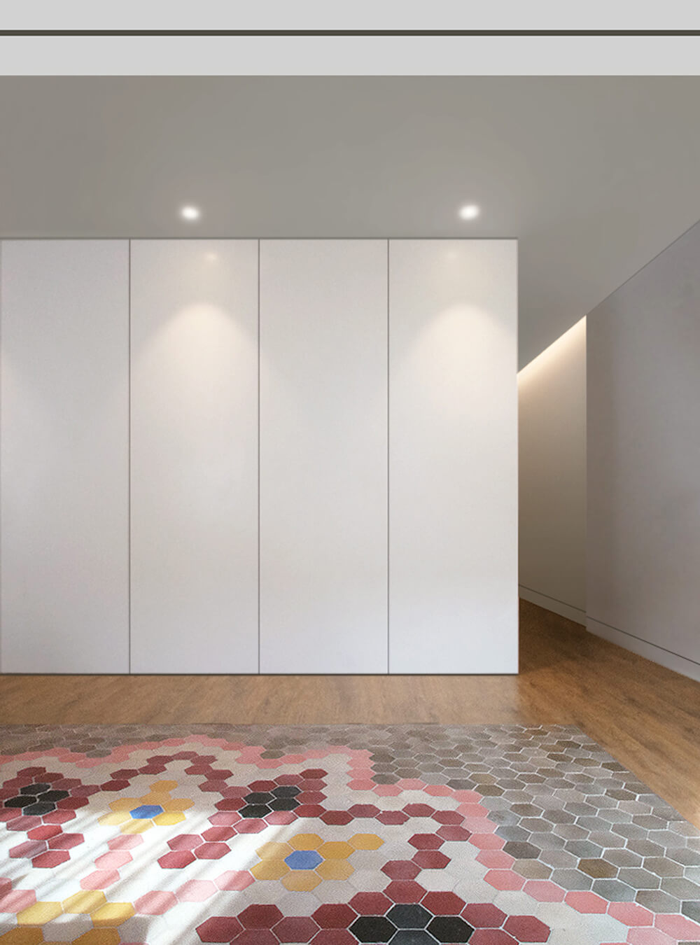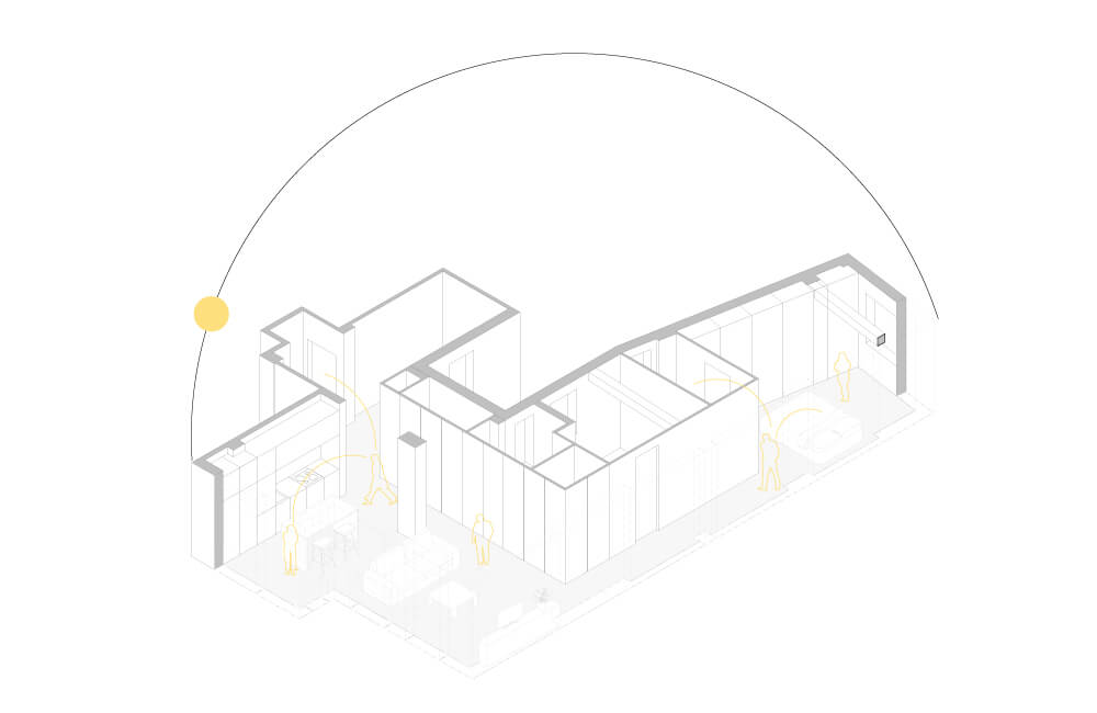 Lo cierto es que, la importancia de este hecho fue tal que la reforma integral de vivienda con Flor y Quique como clientes se desarrolló de la manera más natural. El espacio público se generó como un TOPOS único formado por un salón comedor y cocina que hacían de escenario entre el fondo del telón de la iglesia y el espacio de circulación de la reforma integral de la vivienda.