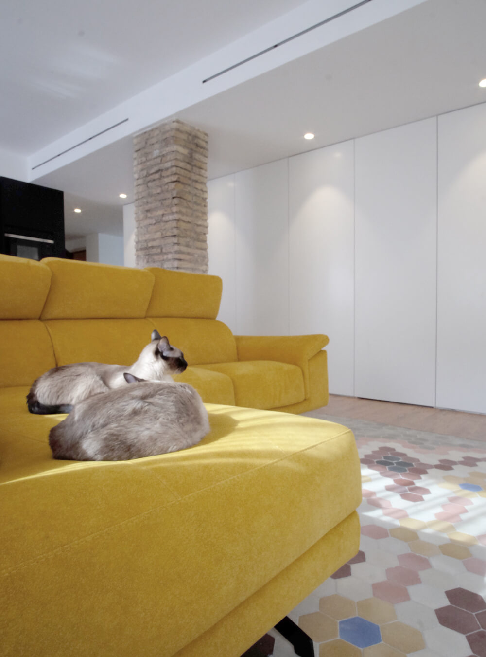 El CRONOS apareció mediante el proyecto de interiorismo. En el proceso de la obra, surgieron oportunidades que se fueron reformulando para adaptarlas a un diseño más contemporáneo. De esta manera, se levantó el suelo hidráulico centenario de la vivienda para generar uno nuevo que representará un símbolo importante para sus futuros habitantes o, por ejemplo, se descubrieron machones dejando visible el ladrillo aragonés original de la vivienda. Todo esto fue un proceso de respeto entre la historia y el presente que nosotros como profesionales y Quique y Flor como habitantes, tuvimos la suerte de disfrutar durante el ejercicio de esta maravillosa reforma integral de vivienda en Zaragoza.