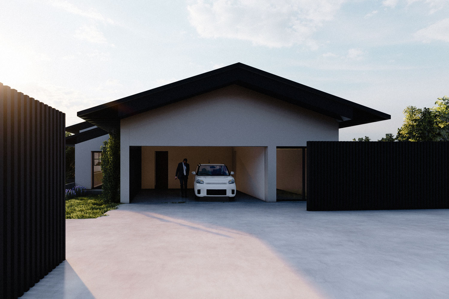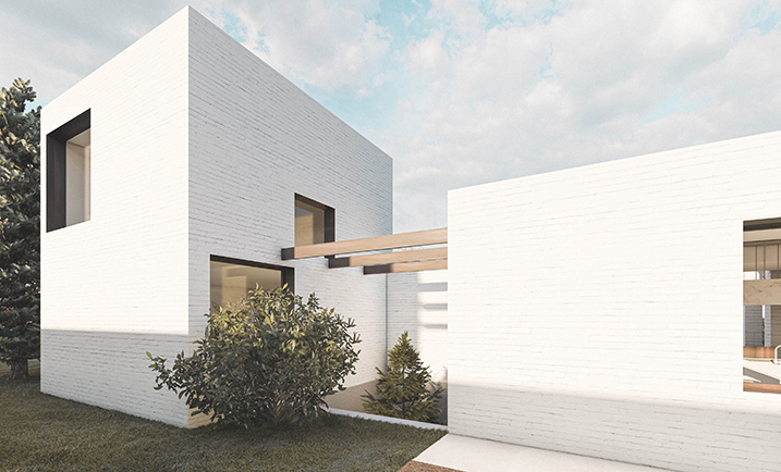 En “vivienda múltiplo de tres” la idea fue diseñarla alrededor de un patio interior central que se expande a tres patios, reflejando tres estilos de vida distintos para tres habitantes. La casa busca luz cenital de los patios y presenta una fachada sin aberturas para privacidad, exceptuando un pequeño faro superior.